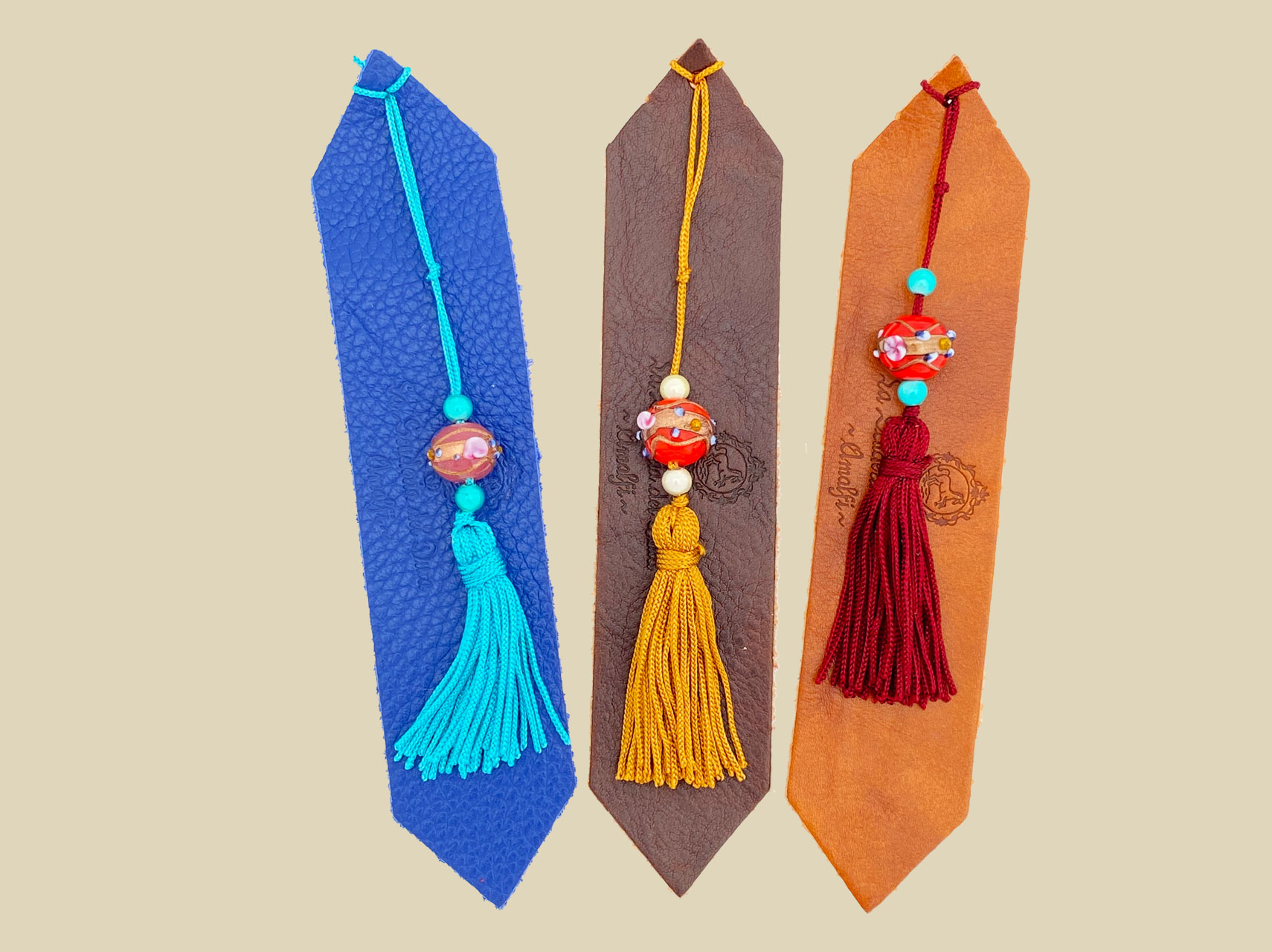 Segnalibro in pelle con ciondolo. I colori della pelle sono assortiti. Lavorazione artigianale.