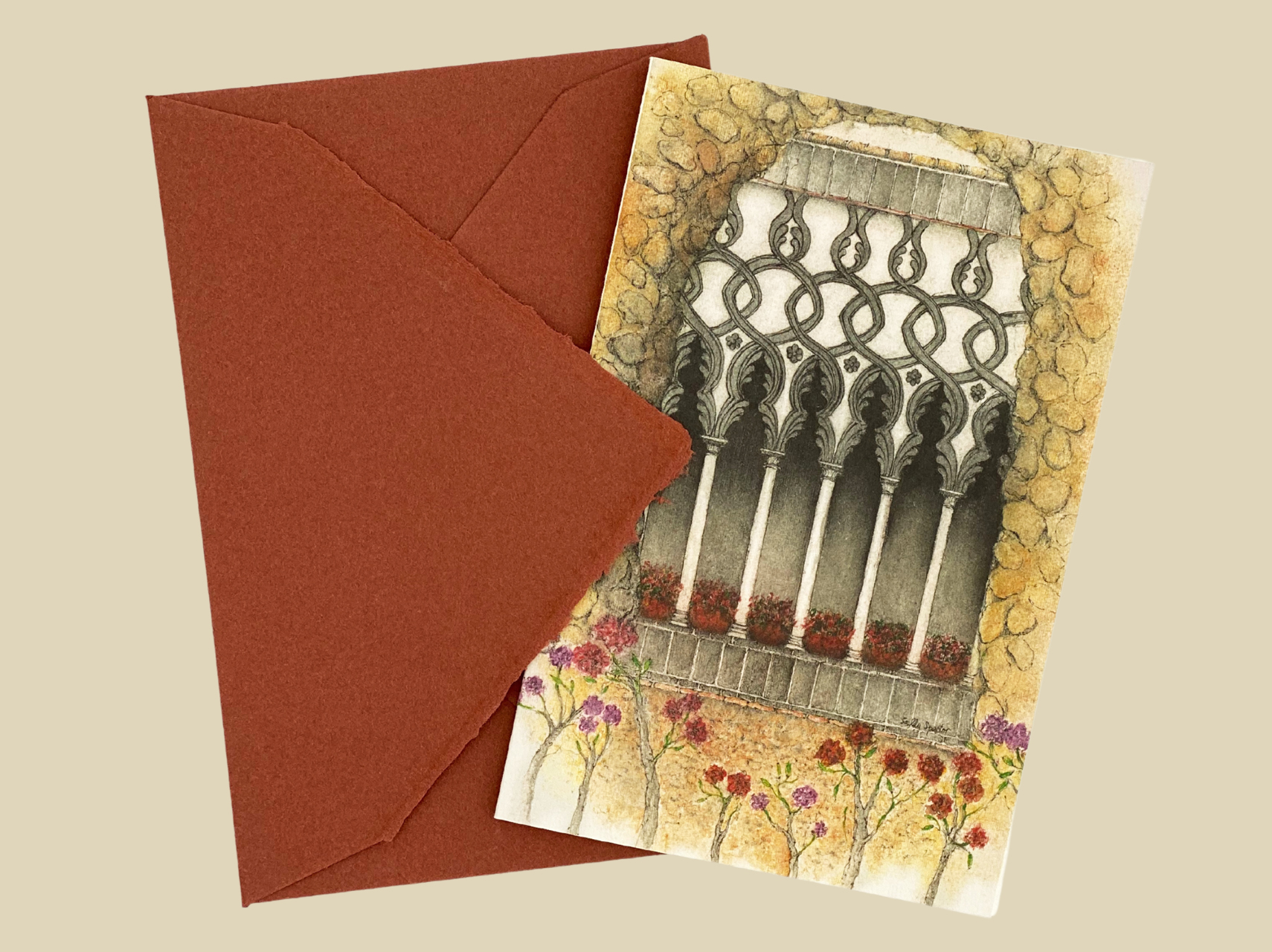 Watercolor Ravello The Cathedral wedding invitation. Ivory wedding invitation which opens like a book, folded is cm. 11,5x17,5 and open cm. 23x17,5. The watermark with the name of the paper mill is present on each invitation.It is illustrated with a watercolor made exclusively for us by the American artist Sally Spector. The wedding invitation is sent open, not folded, facilitating all typographic and digital printing operations. The envelope must be added to the wedding invitation, ivory or colored Amalfi paper, with the watermark of the paper mill, possibly also an invitation 8.5x11.5.