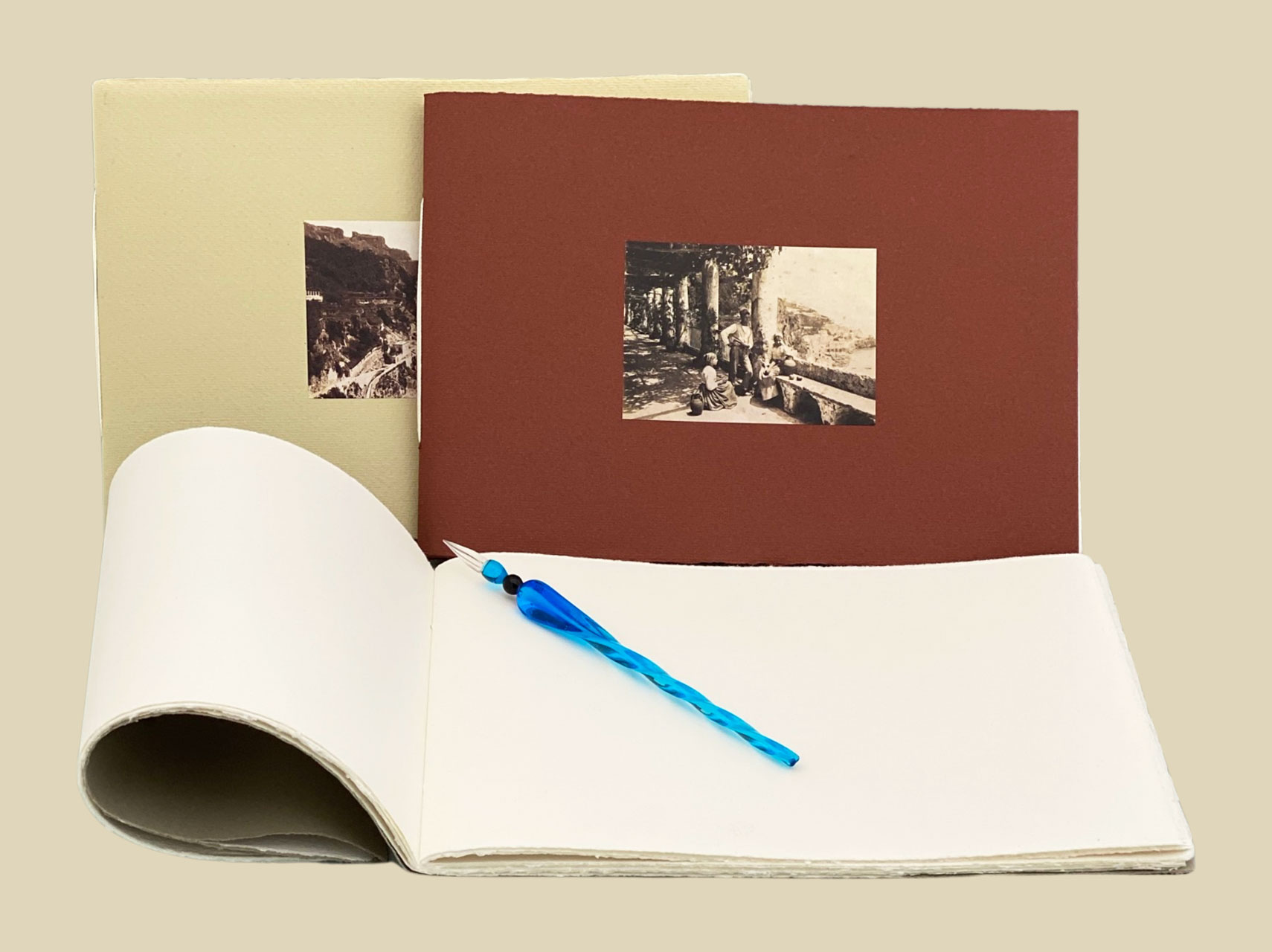Amalfi cotton paper horizontal sketchbook gr. 150 cm. 18x26 with vintage photo applications, available in various colors of your choice.