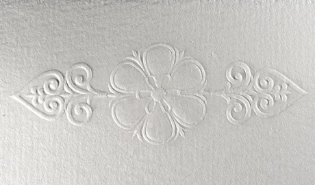 Box of 10 A4 sheets and 10 envelopes 11x22cm. Each sheet has a relief print of a flower, made using the dry press technique.