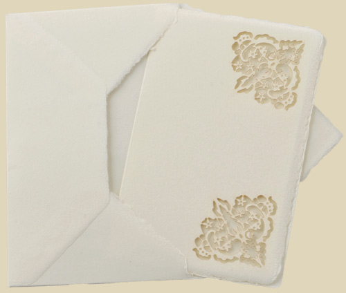 Set of 5 note cards and 5 14x9cm envelopes with Daisy fretwork pattern. The carving is carried out using a fretwork method carried out by laser on the edges of the paper. This method has allowed us to create a "lace" on the traditional Amalfi paper. The paper is ivory coloured.