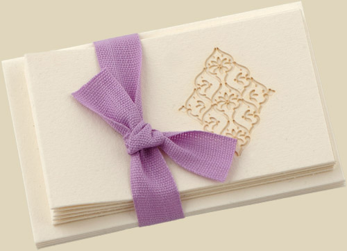 Set of 5 mini folded cards and 5 mini 11x7cm envelopes. The carving is carried out using a fretwork method carried out by laser on the edges of the paper. This method has allowed us to create a "lace" on the traditional Amalfi paper. The paper is ivory coloured.