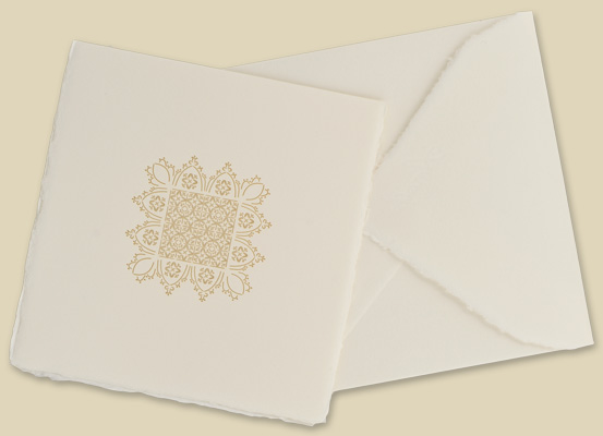 Partecipazione doppio cartoncino avorio. Si apre a libro e la filigrana mostra impresso nella carta il nome della cartiera. Realizzata con la lavorazione al laser presenta un fine decoro che ricorda un antico merletto al centro del cartoncino.