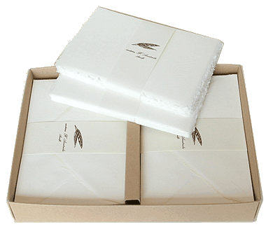 This box contains 100 wedding invitations, postcard format IVORY cm. 11,5x17,5 and 100 envelopes cm. 12x18. The watermark with the name of the paper mill is visible on the invitation. The watermark 'Amalfi' is visible on the envelope. The small ivory or white invitations are not included in the box and must be purchased seperately. Amalfi paper can be handwritten, printed in a traditional printers or using a laser or ink-jet printer. We advise you to turn to a print shop or a digital printing store and to print in a brown italic font. Printing must be carried out on the side which shows the watermark at the bottom right hand corner.