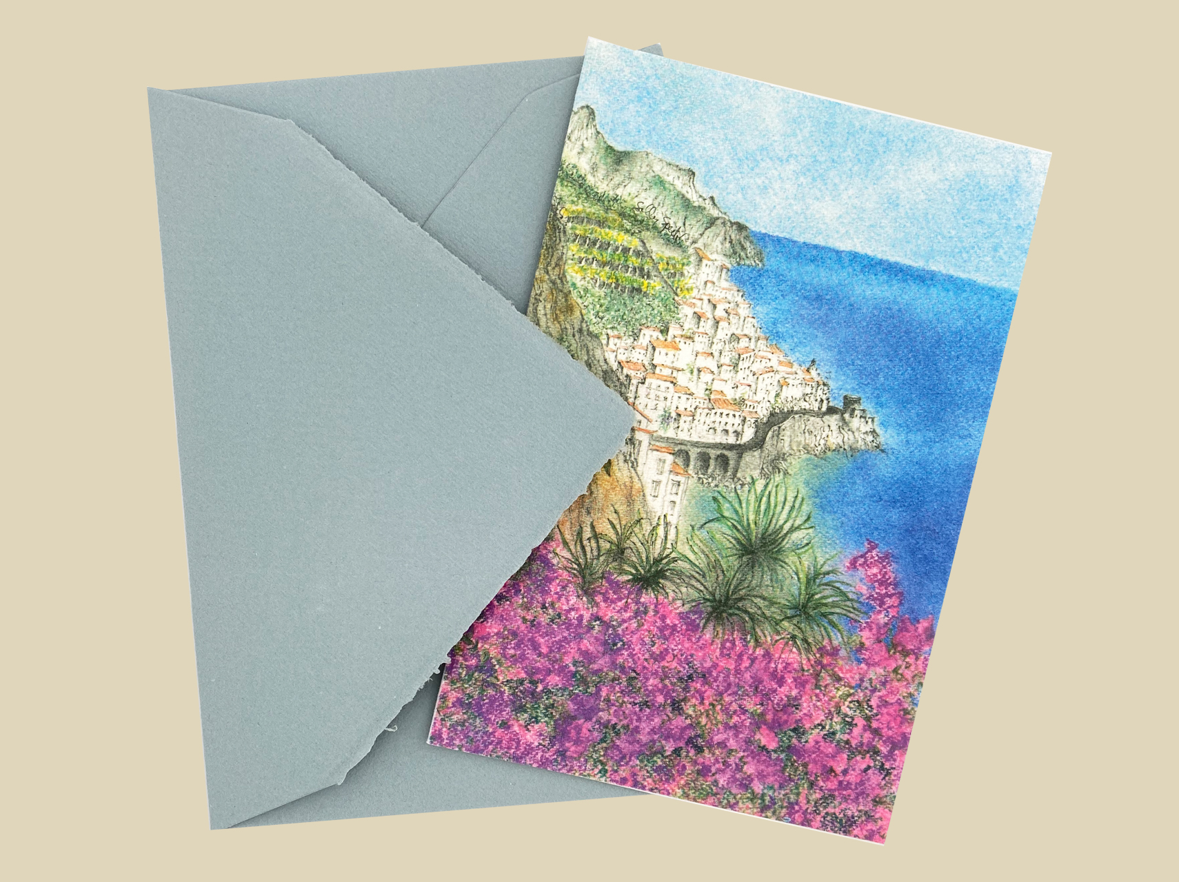 Partecipazione cartoncino acquerello Amalfi dal Cappuccini